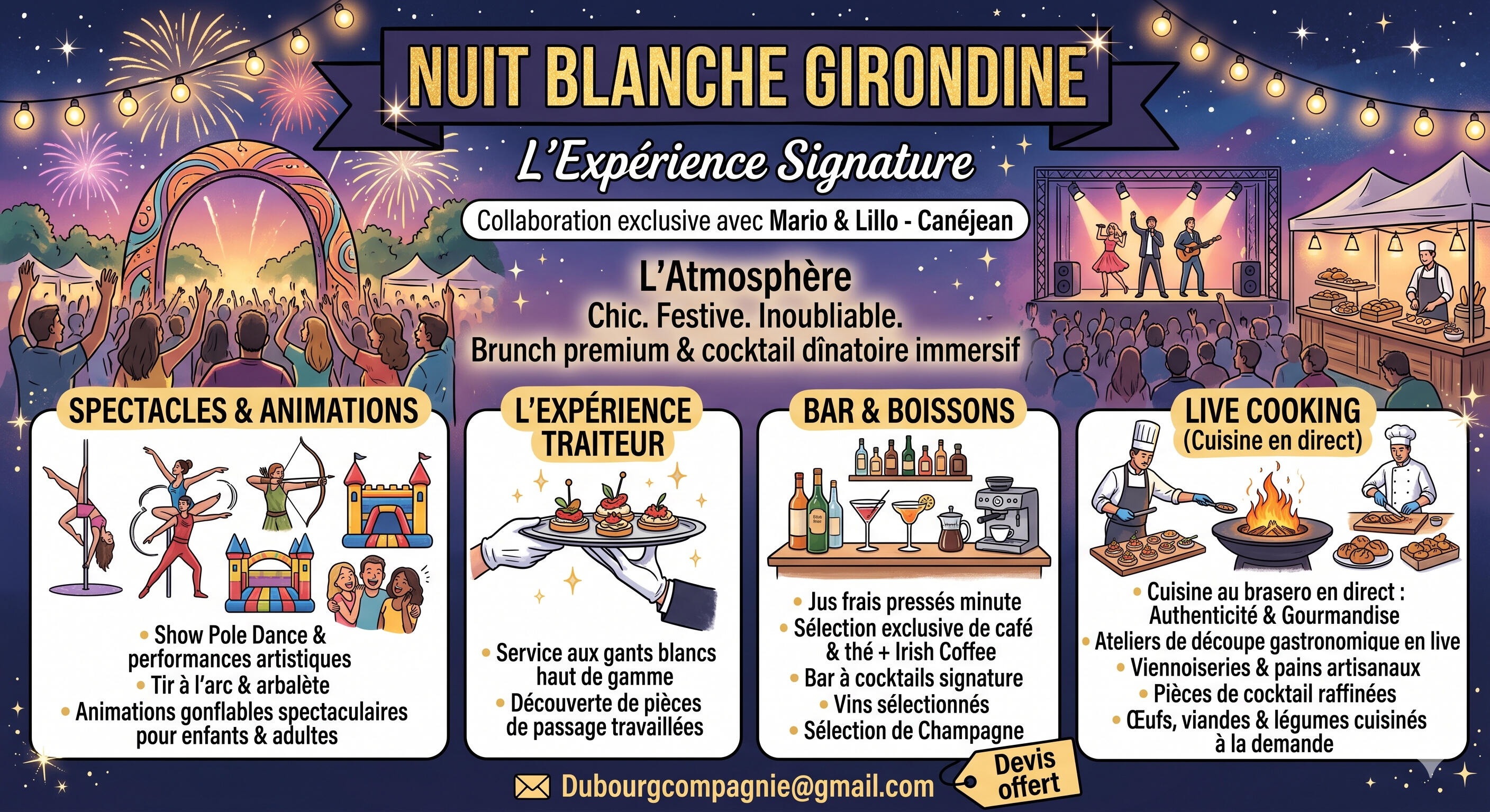 Nuit Blanche Girondine est un Traiteur d'un nouveau genre. C'est un E- TRAITEUR !! Site proposant plusieurs services créant ainsi la possibilité à tous de créer sa propre fête sur mesure. Achat d'alcools, location de matériels, animations foods, animations spectacles....